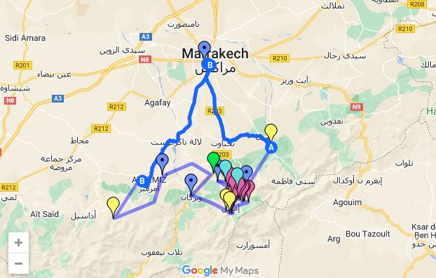 Si tenéis poco tiempo, la ruta se puede adaptar a 6 días como se muestra en el mapa. Es una estupenda ruta en BTT por la zona del Parque Natural de Toubkal y el valle de Ourika.